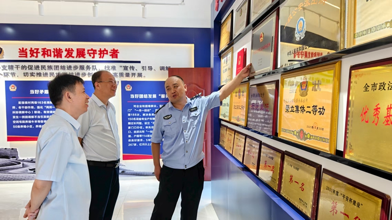 慰問(wèn)組一行來(lái)到磨頭派出所,在民警的引導(dǎo)下,首先參觀了派出所文化長(zhǎng)廊與榮譽(yù)展廳,詳細(xì)了解了磨頭派出所歷史沿革與取得榮譽(yù)。